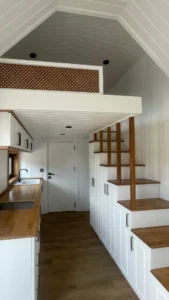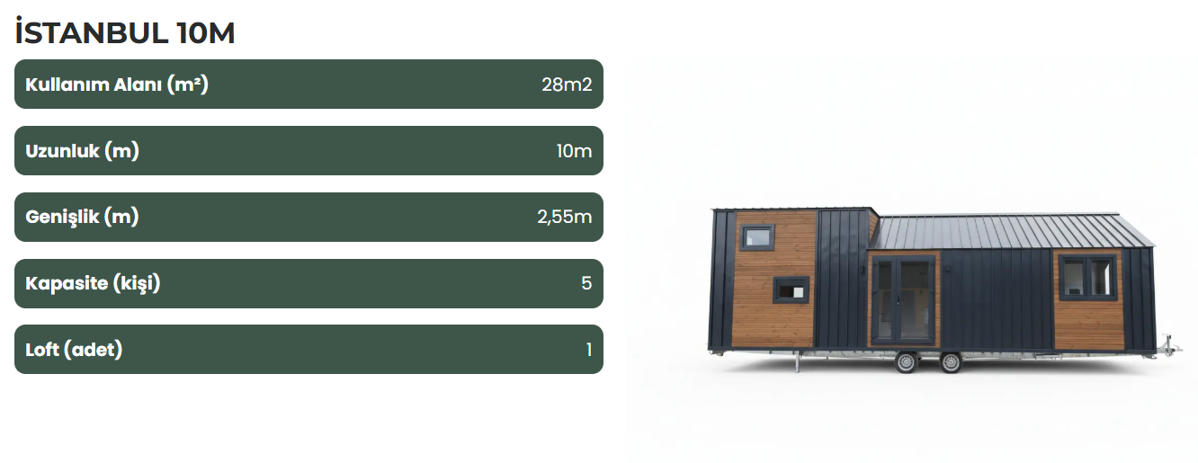 İstanbul Model Tiny House, modern tasarımı ve yüksek yalıtımıyla dört mevsim konfor sunar. Loft yapısı ve ferah iç mekanı sayesinde aileniz veya sevdiklerinizle tatil keyfini yaşarken, mobil yapısı ile geleceğe yatırım fırsatını da değerlendirebilirsiniz.